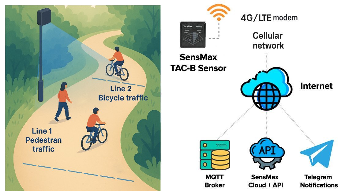 - Sensor layer — TAC-B 4G mmWave radar detects movement, direction and speed, separates pedestrians from cyclists and scooters, and counts IN/OUT crossings over virtual lines.